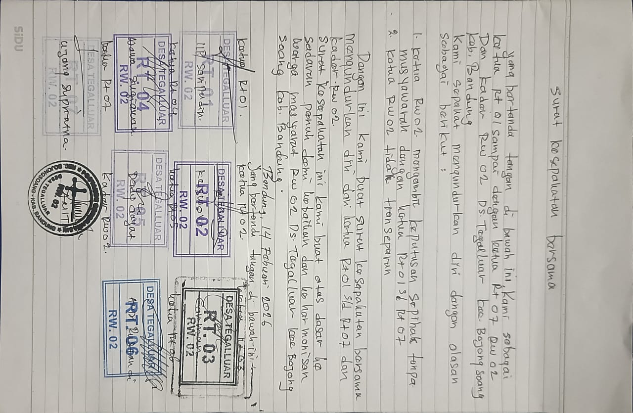 Sejumlah ketua RT/01 Sampai dengan Rt/07 sebelumnya menyatakan kesepakatan mundur secara lisan. Namun kepala desa menegaskan belum menerima pengunduran diri tertulis dari pihak mana pun. “Jadi hanya baru lisan saja,” ujar Galih Hendrawan, S.I.P saat dikonfirmasi.